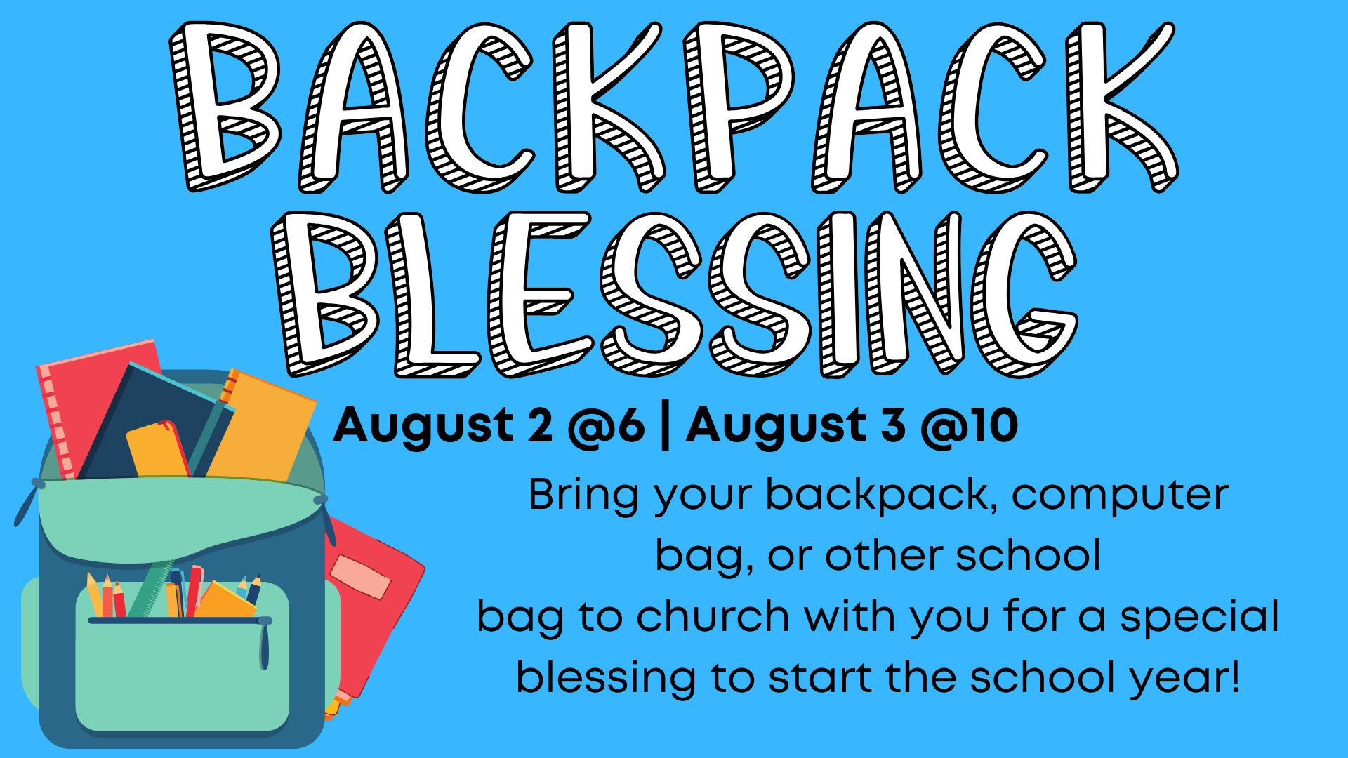 Backpack Blessing Saturday, August 2, 2025 6:00 PM Sunday, August 3, 2025 10:00 AM Google Calendar ICS