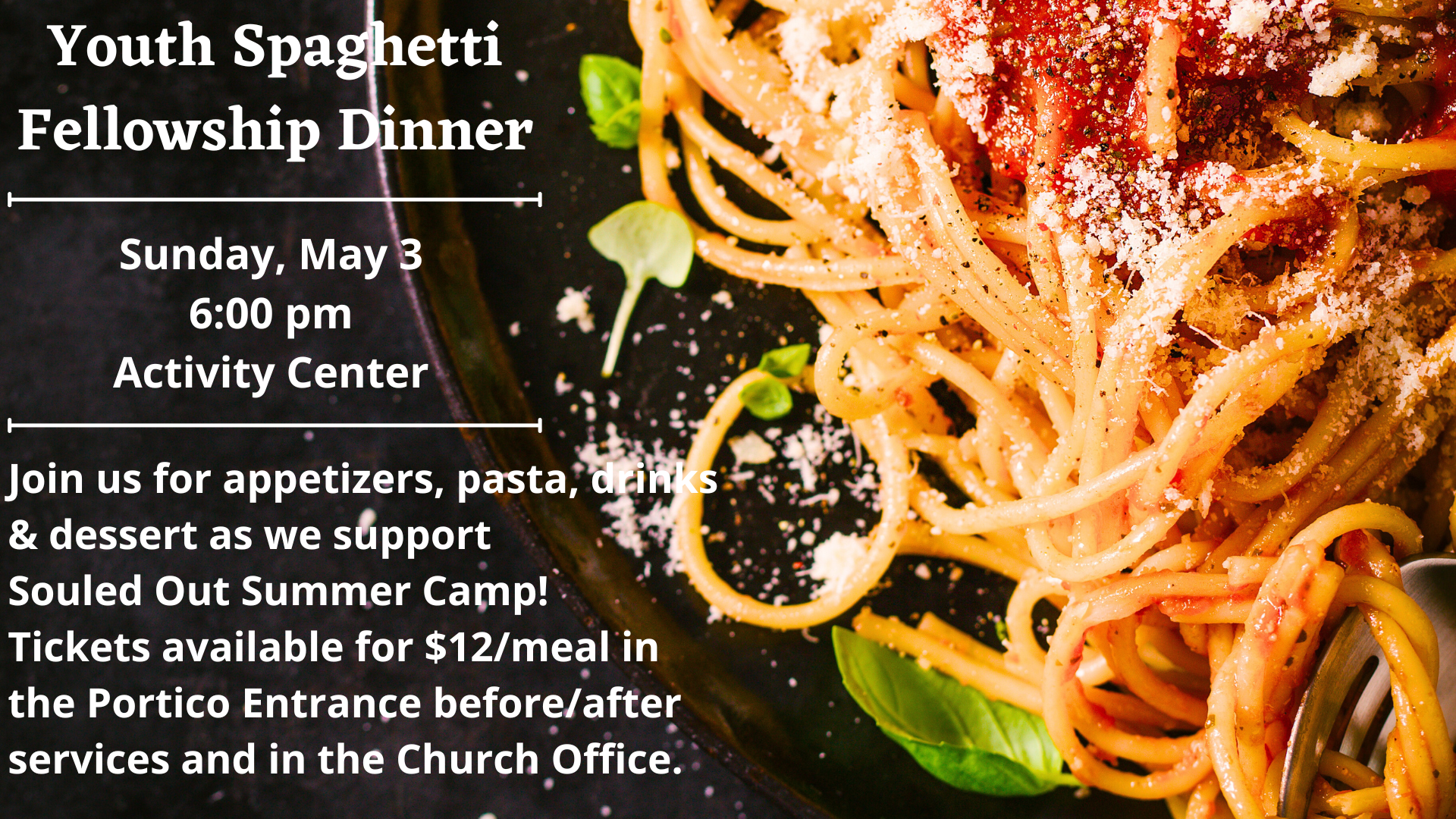 Back to All Events Youth Spaghetti Fellowship Dinner Sunday, May 3, 2026 6:00 PM 8:00 PM Google Calendar ICS